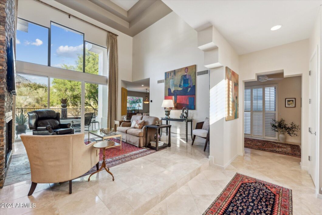 The entry foyer of this home opens up to a huge living room with fireplace, a high open ceiling and sliding glass doors onto the patio beyond the picture windows framing the mountain peak beyond the private pool. The spacious master bedroom suite features a spa tub, twin vanities, a large walk-in closet and natural lighting. Illuminating the kitchen are a skylight and glass brick wall Off one side of the kitchen is a formal dining room with it’s view of PIESTEWA PEAK, off the other is a breakfast room with a lovely garden atrium. Two upstairs bedrooms each have their own bath and walk-in closet. Total 3 bedrooms, 3 full baths plus a powder room. Approximately 2,450 square feet.